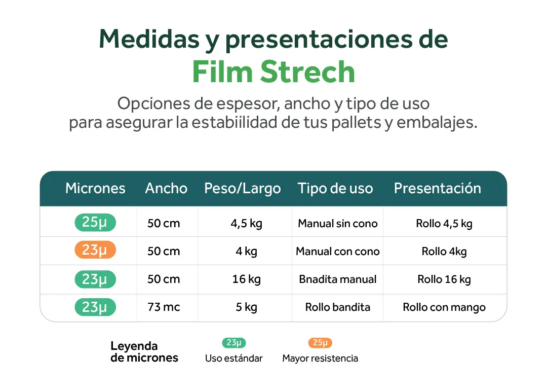 Trabajamos tanto con rollos manuales (con y sin mango, con bandita) como con film para máquinas envolvedoras automáticas, para que puedas optimizar consumo, tiempos de embalaje y seguridad de tus cargas.